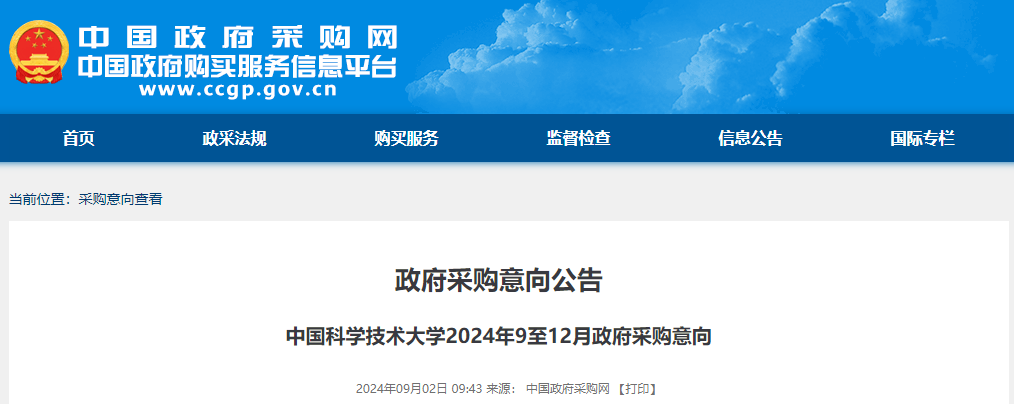 中國科學技術大學2024年9至12月政府采購意向