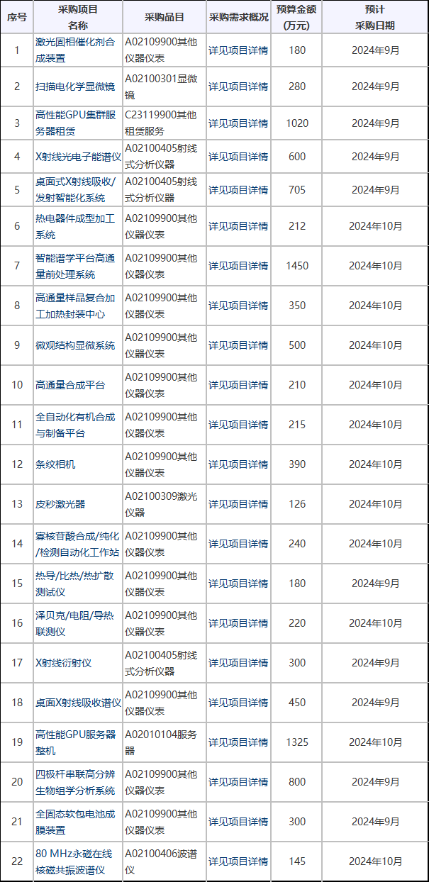 2024年9月2日,中國科學技術大學公布2024年9至12月政府采購意向清單,涉及掃描電化學顯微鏡、X射線衍射儀、疲勞試驗機、測量儀、高速示波器等多種儀器設備,預算總額超過1.6億元。