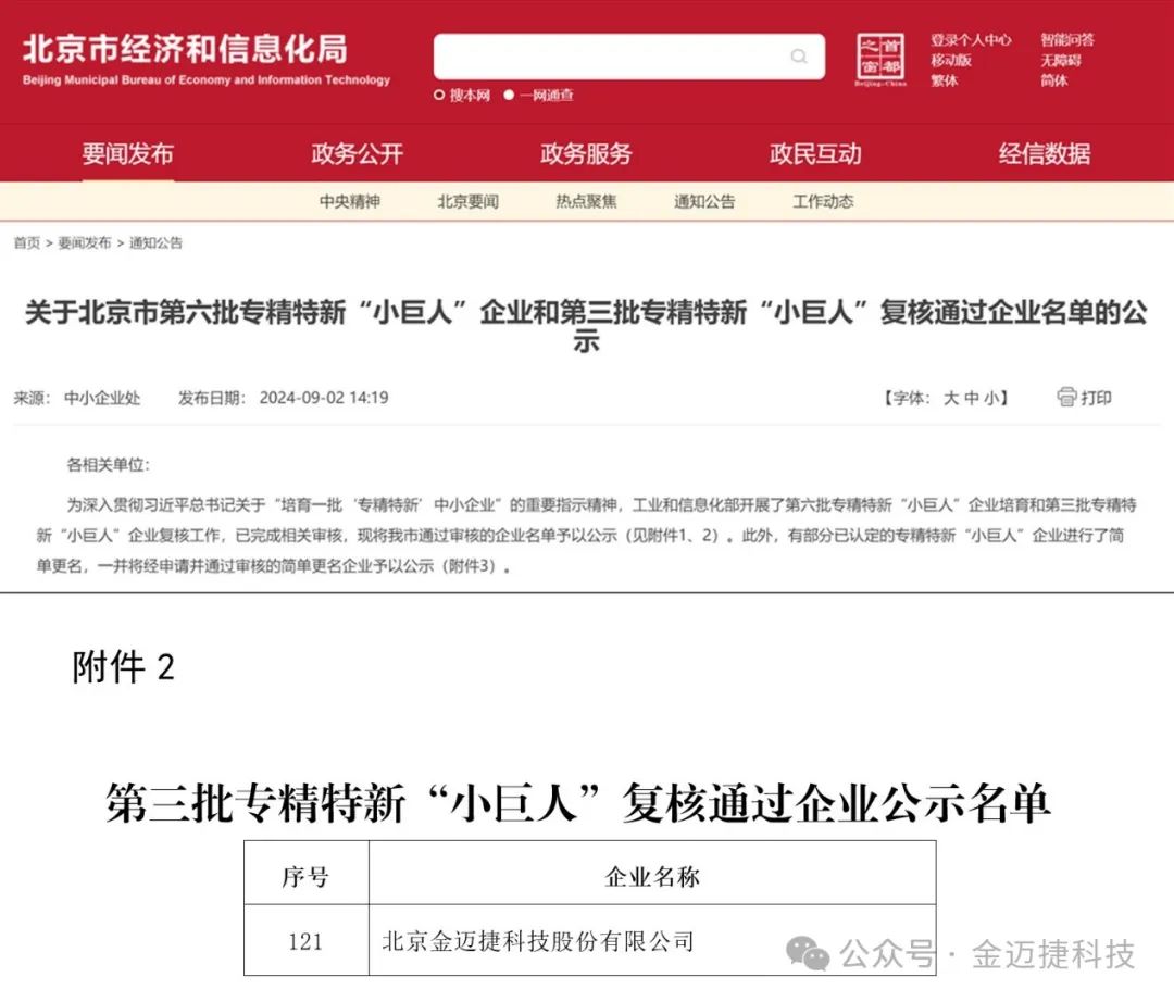 近日,國家工業(yè)和信息化部開展了第三批專精特新“小巨人”企業(yè)復核和第六批專精特新“小巨人”企業(yè)培育工作。金邁捷于2021年榮獲國家專精特新“小巨人”企業(yè)榮譽稱號,三年來憑借卓越的創(chuàng)新實力和穩(wěn)健的發(fā)展態(tài)勢,成功通過復核,再次榮獲國家級專精特新“小巨人”企業(yè)稱號。