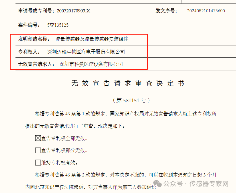 826日,國家知識產權局發布第581151號《無效宣告請求審查決定書》,宣布專利號為“ZL200720170903.X”的發明創造專利流量傳感器及流量傳感器安裝組件專利權全部無效。