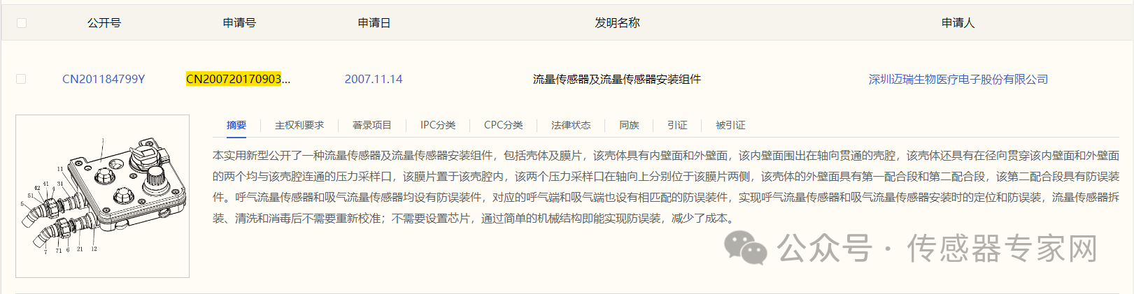 該傳感器專利由邁瑞醫療于200711月申請,并于20091月,取得實用新型專利權授予,據專利描述: