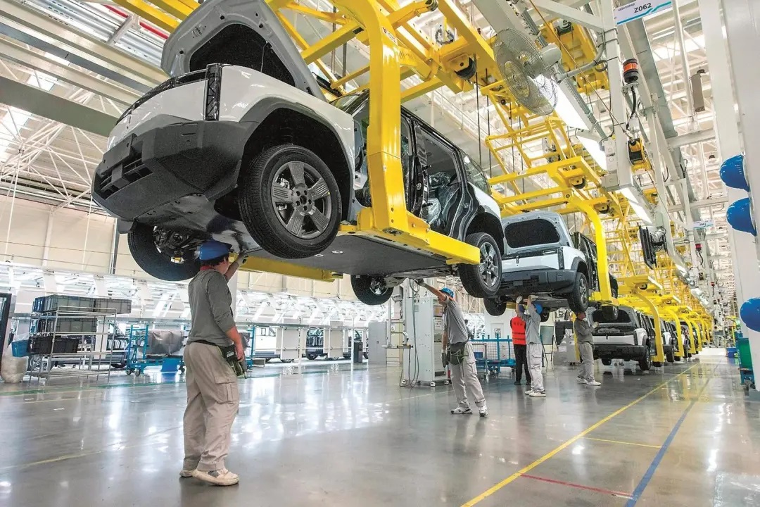 在蕪湖市某新能源汽車生產車間里,工人在進行組裝生產作業。