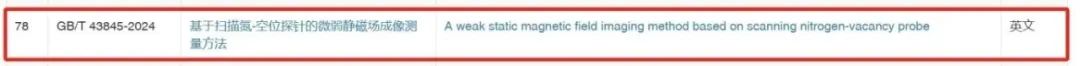 《基于掃描氮-空位探針的微弱靜磁場成像測量方法》(A weak static magnetic field imaging method based on scanning nitrogen-vacancy probe)國家標準外文版:https://std.samr.gov.cn//gfs/search/gfsDetailed?id=26DCF738D1989867E06397BE0A0A5B2D