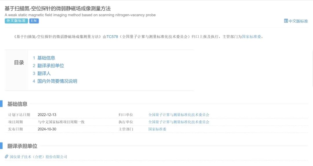 近日,國家市場監督管理總局(國家標準化管理委員會)發布2024年第27號公告,由國儀量子技術(合肥)股份有限公司牽頭制定的《基于掃描氮-空位探針的微弱靜磁場成像測量方法》(A weak static magnetic field imaging method based on scanning nitrogen-vacancy probe)國家標準外文版正式發布實施。國家標準外文版的制定,有利于消除國際貿易屏障,加強國際技術交流,同時為將來國際標準的制定奠定基礎。