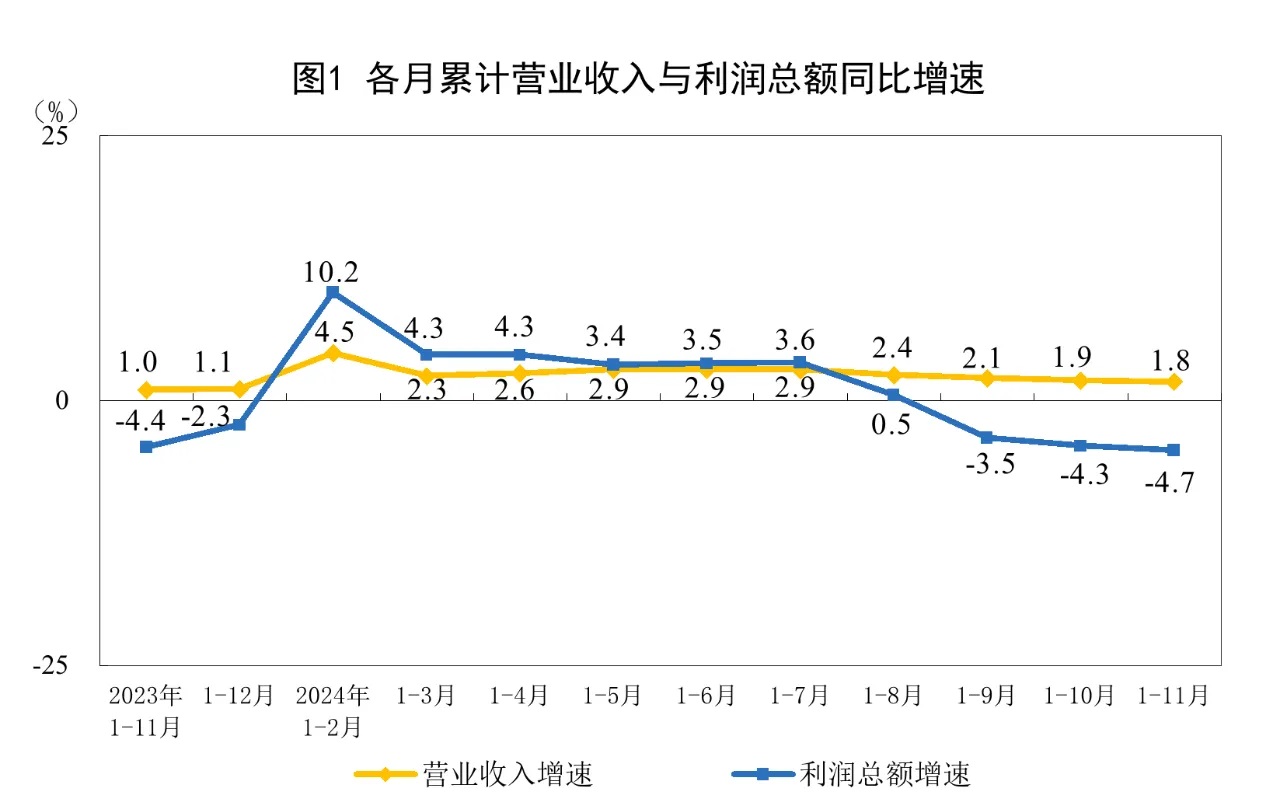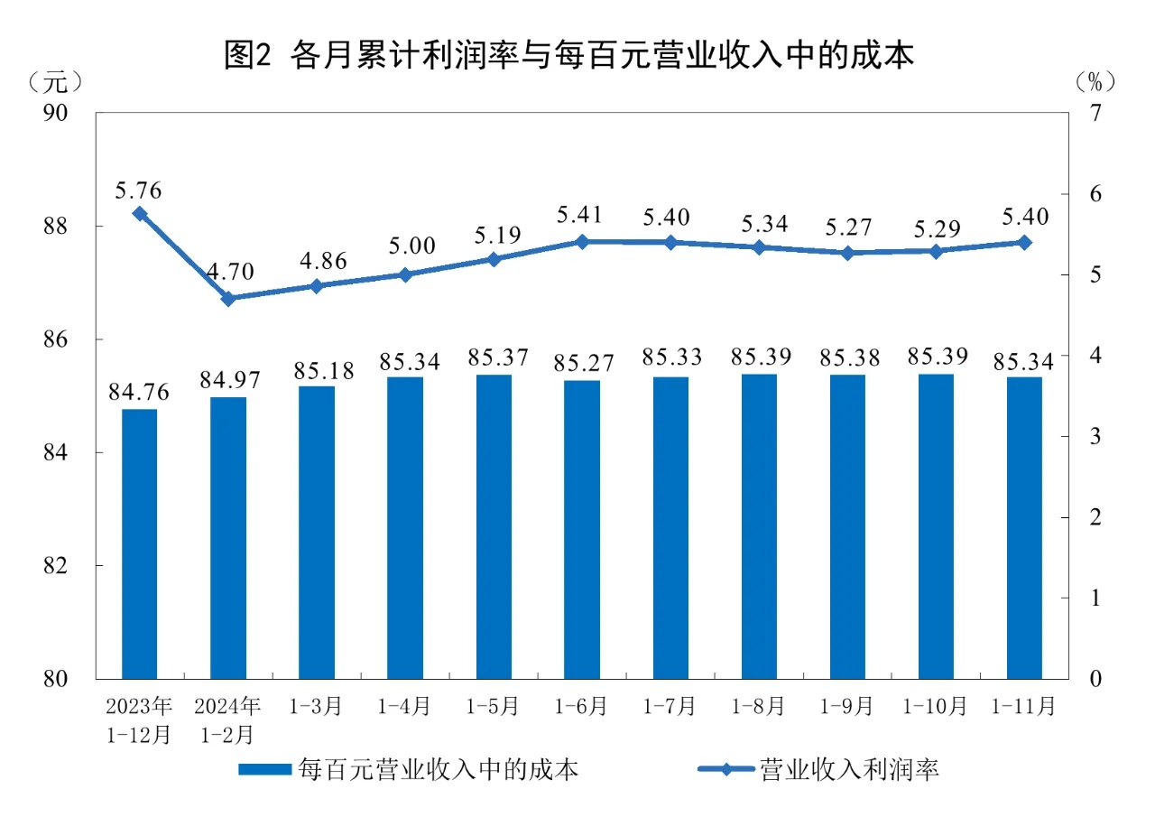 1—11月份,規模以上工業企業實現營業收入123.48萬億元,同比增長1.8%;發生營業成本105.38萬億元,增長2.3%;營業收入利潤率為5.40%,同比下降0.37個百分點。