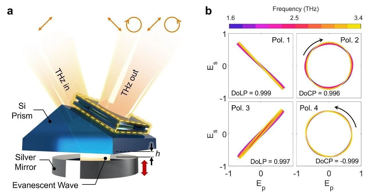 在這項(xiàng)研究中,科研人員新研發(fā)的太赫茲波偏振調(diào)制器,可以靈活控制太赫茲波偏振,輸出任意的偏振態(tài)。“相比已報(bào)道的其他太赫茲波偏振調(diào)制器,我們研發(fā)的偏振調(diào)制器在多功能性、大工作帶寬以及高控制精度方面取得顯著突破,可為光譜檢測提供先進(jìn)的偏振解析能力,能滿足材料物理特性研究、生物制藥品質(zhì)監(jiān)測等應(yīng)用需求,也可作為下一代信息技術(shù)的核心部件,在高速通信中降低傳輸損耗、提高數(shù)據(jù)吞吐量。”陳學(xué)權(quán)說。
