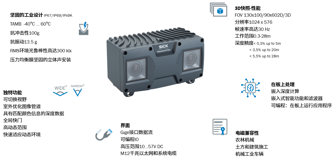出口市場拓展:中國工程機械出口占比持續提升(2023年挖掘機出口占比41%),東南亞、非洲等地區對性價比高、適應性強的設備需求旺盛。SICK的3D雙目相機Visionary-B Two便于快速適配不同地區機械標準,搶占海外智能化升級先機。