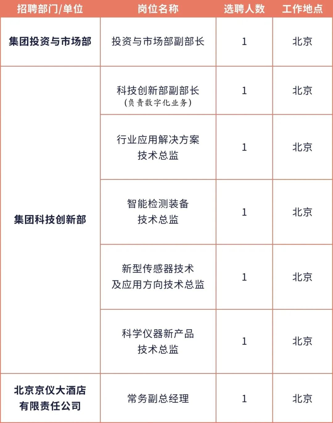 為進一步深化改革創新,提升經營管理水平,促進人才資源合理配置,夯實人才隊伍建設工作,結合集團管理實際和發展需要,京儀集團現面向集團內外部市場化選聘經營管理人才和高端技術人才。具體事項公告如下:
