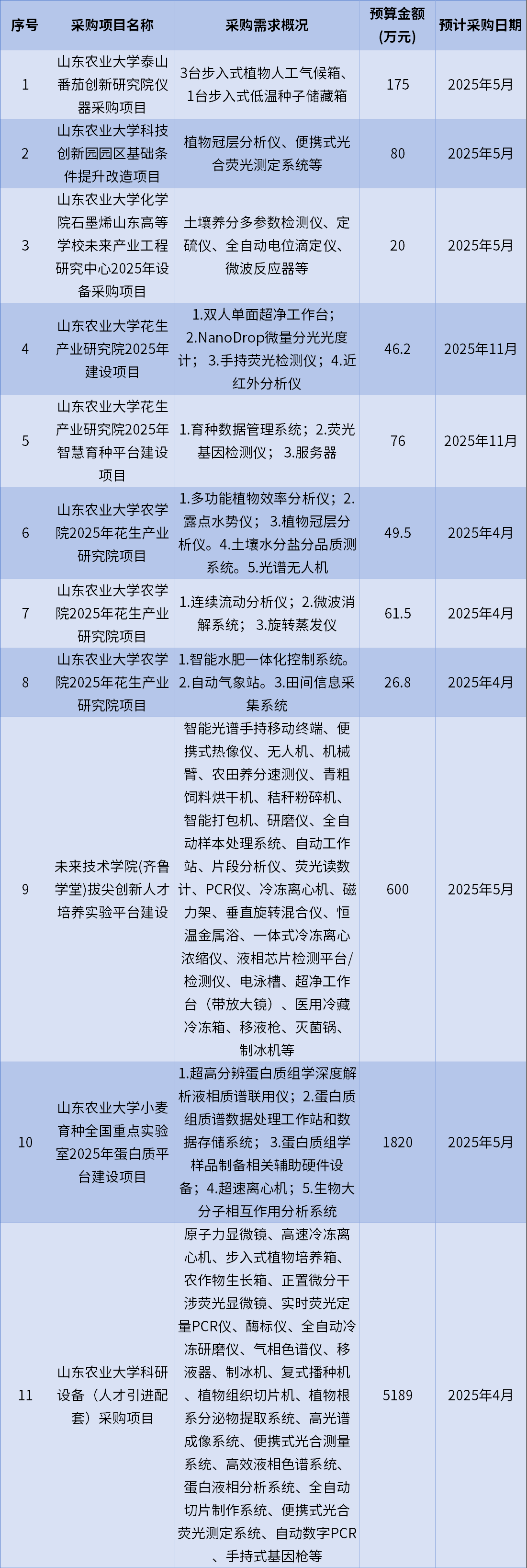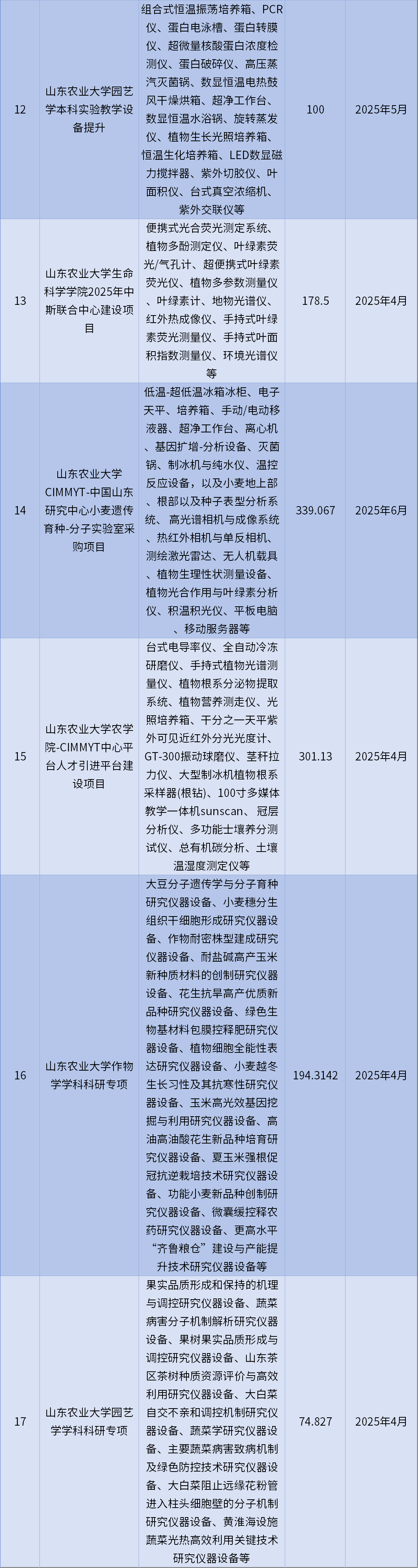 山東農(nóng)業(yè)大學儀器采購意向匯總,本次匯總含17項采購專項,預計采購時間在2025年4月、5月、11月,預算金額共計9331.8382萬元。