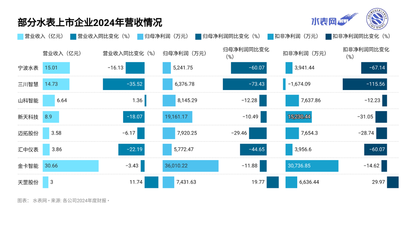 日前,多家水表上市企業(yè)發(fā)布2024年度財(cái)報(bào)。受宏觀經(jīng)濟(jì)波動(dòng)、行業(yè)需求收縮及供應(yīng)鏈成本上升等多重挑戰(zhàn)影響,行業(yè)內(nèi)營(yíng)收增長(zhǎng)承壓,多家表企營(yíng)業(yè)收入、凈利潤(rùn)同比下滑。