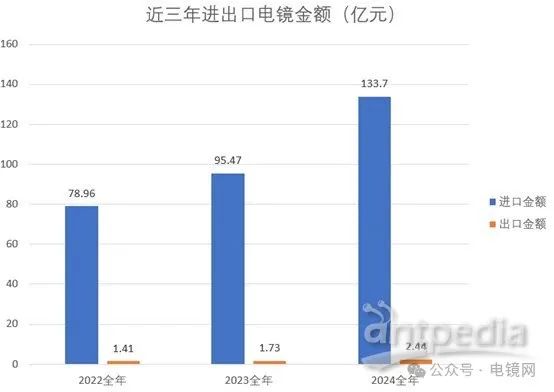金額方面,電子顯微鏡(不含光學顯微鏡)的進口金額從2022年的78.96億元躍升至2024年的133.7億元,復合增速高達30.2%。出口金額從1.41億元增至2.44億元,復合增長率為73 %。