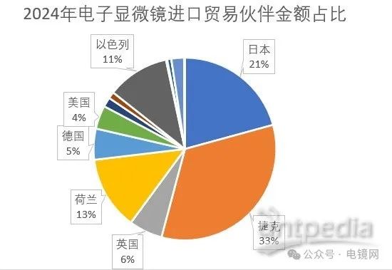 2024年電子顯微鏡進口貿易伙伴金額中,捷克拔得頭籌,占據了33%的比例,其次是日本占21%。荷蘭和以色列分別占據13%11%,英國和德國分別占據6%5%,美國則占5%
