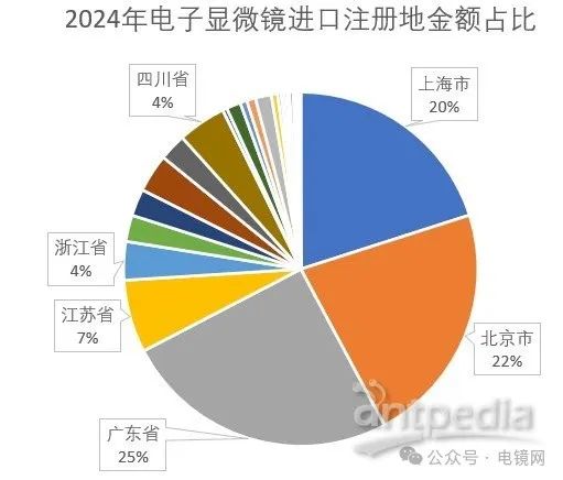 近三年來,上海市、北京市、廣東省、江蘇省、湖北省和浙江省是主要的電子顯微鏡進口地區。上海市進口量最多,2024年進口806臺;北京市和廣東省穩定增長,江蘇省呈現先增后降趨勢。整體顯示了不同地區的市場需求和發展趨勢。