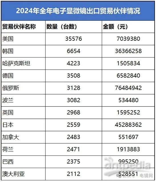 2024年全年,我國電子顯微鏡出口總數量為83169臺,出口金額為2.44億元。美國遙遙領先,出口臺數遠超其他國家,還有韓國、哈薩克斯坦、德國、俄羅斯分別占據前五市場。金額上,俄羅斯優勢明顯,出口金額為7649萬,幾乎是第二名韓國的兩倍。