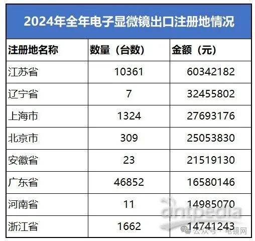 2024年全年,我國電子顯微鏡出口注冊地主要集中在江蘇省、廣東省、上海市等地。其中,廣東省以46852臺的出口數量位居首位,顯示出其在電子顯微鏡出口領域的強勁實力。江蘇省緊隨其后,出口數量達到10361臺,位居第二。