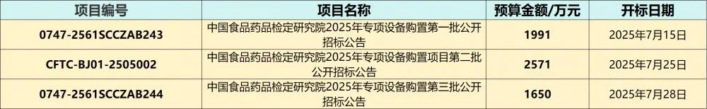 中國政府采購網消息,近日,中國食品藥品檢定研究院就2025年專項設備購置項目分別于6月24日和7月4日發布招標公告,招標總金額為6212萬元,采購的儀器設備共計605臺/套,包括超高效液相色譜儀、生物熒光微生物快檢系統、小動物活體成像系統等。