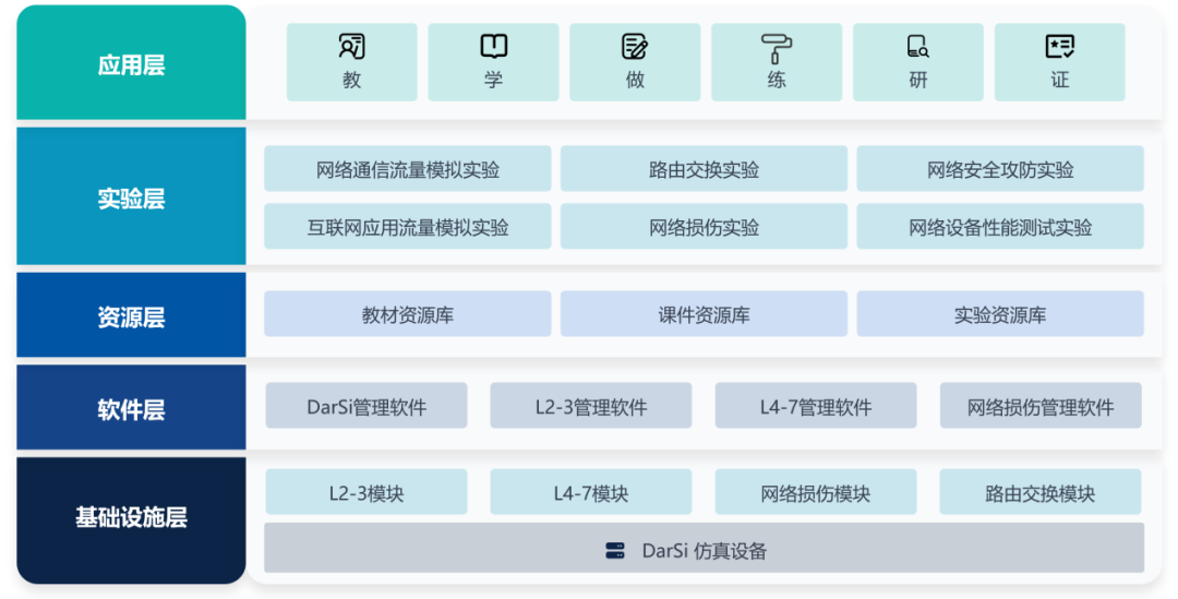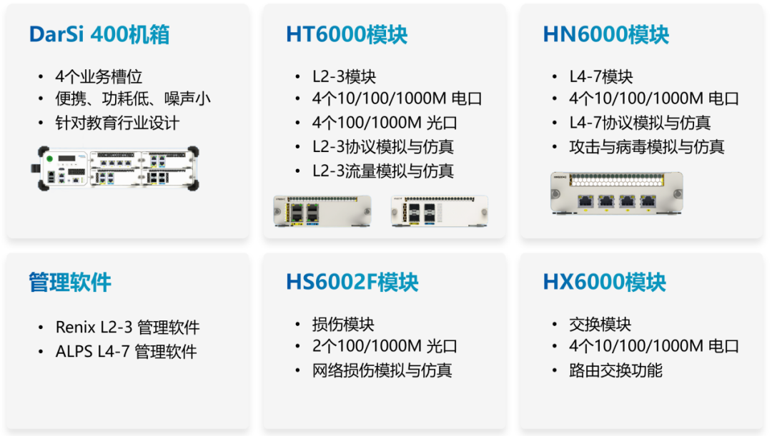5. 基礎(chǔ)設(shè)施層 (Infrastructure Layer)DarSi 設(shè)備為基礎(chǔ),集成了模塊化的硬件功能,包括 L2-3模塊、L4-7模塊、網(wǎng)絡(luò)損傷模塊和路由交換模塊。這為模擬真實(shí)網(wǎng)絡(luò)環(huán)境的“規(guī)?!焙汀皬?fù)雜度”提供了強(qiáng)大的硬件保障。