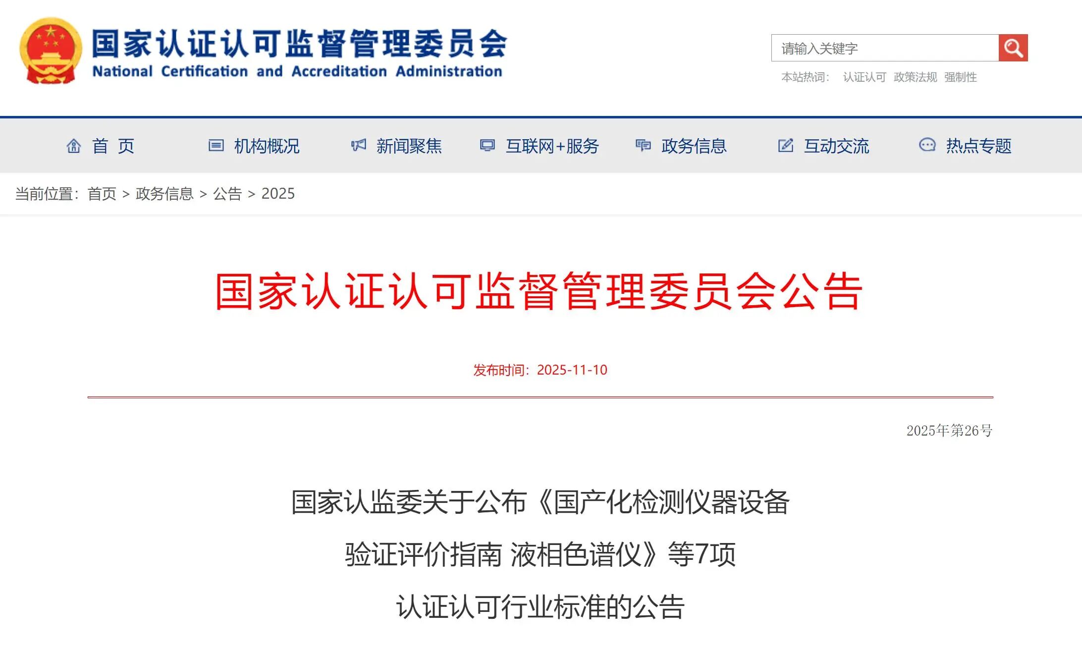 《國產化檢測儀器設備驗證評價指南 液相色譜儀》等7項認證認可行業標準已經國家認監委審核,現予公告。