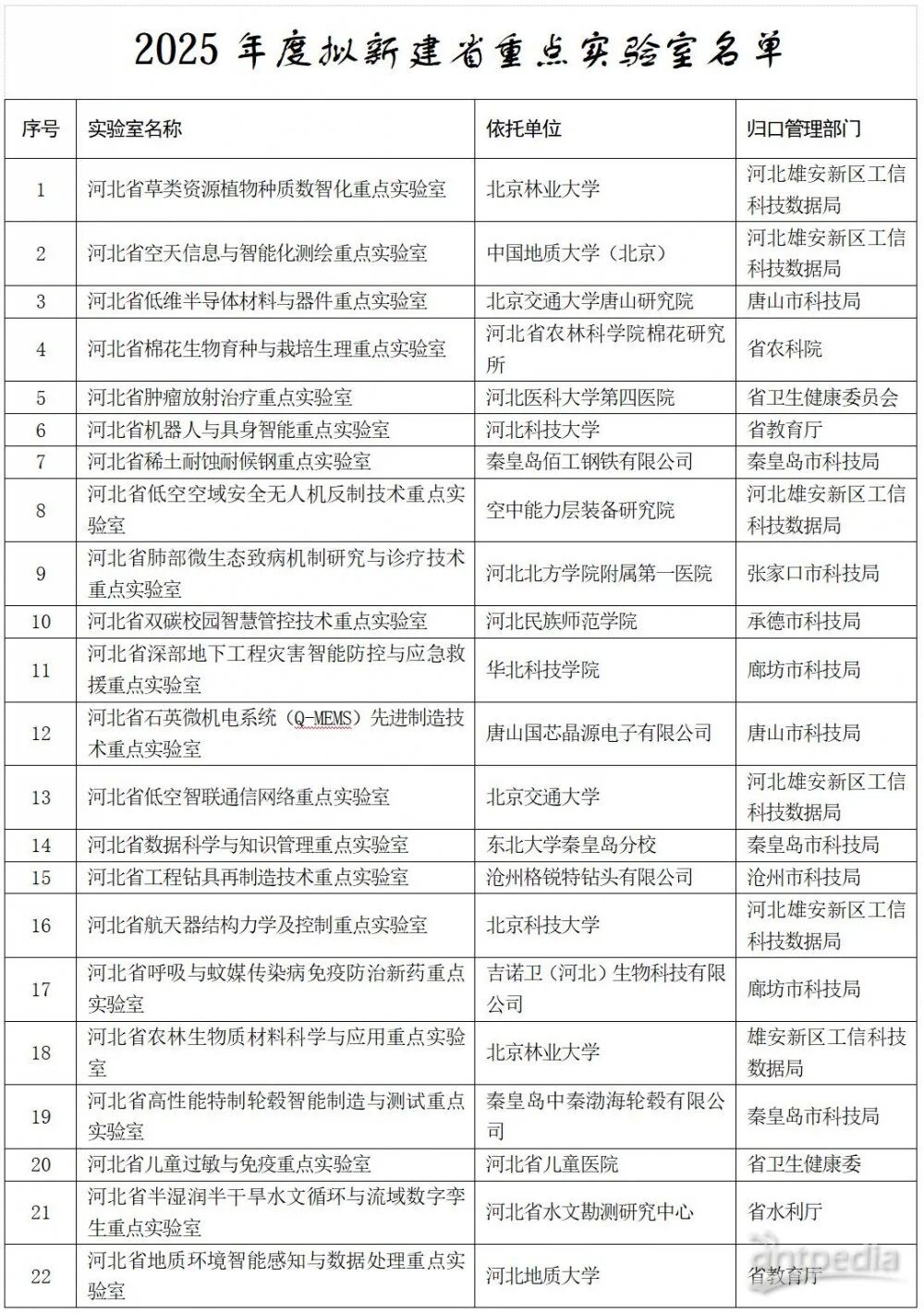 近日,河北省科學技術廳發布消息,2025 年度擬新建 43 家省重點實驗室和 86 家省技術創新中心,目前正處于公示階段。