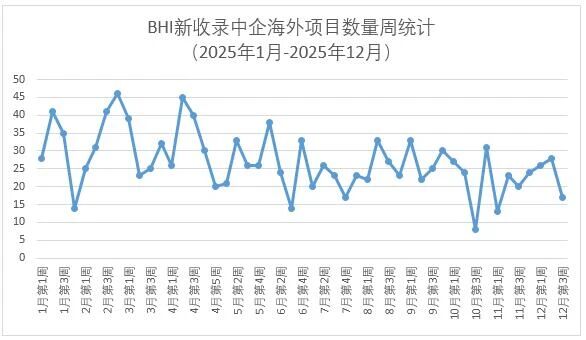 據(jù)BHI中企海外項目數(shù)據(jù)庫監(jiān)測,12月15日-19日BHI新收錄中企新簽約/中標/公告海外項目17個,較此前有所回落。2025年新收錄項目超過1320個。近一年每周新收錄項目數(shù)量趨勢統(tǒng)計詳見下圖。