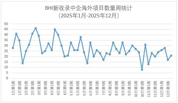據(jù)BHI中企海外項目數(shù)據(jù)庫監(jiān)測,上周(1222-26日)BHI新收錄中企新簽約/中標/公告海外項目21個,較此前小幅回升。其中中國交建7個項目、中國能建6個項目。2025年新收錄項目超過1340個。近一年每周新收錄項目數(shù)量趨勢統(tǒng)計詳見下圖。