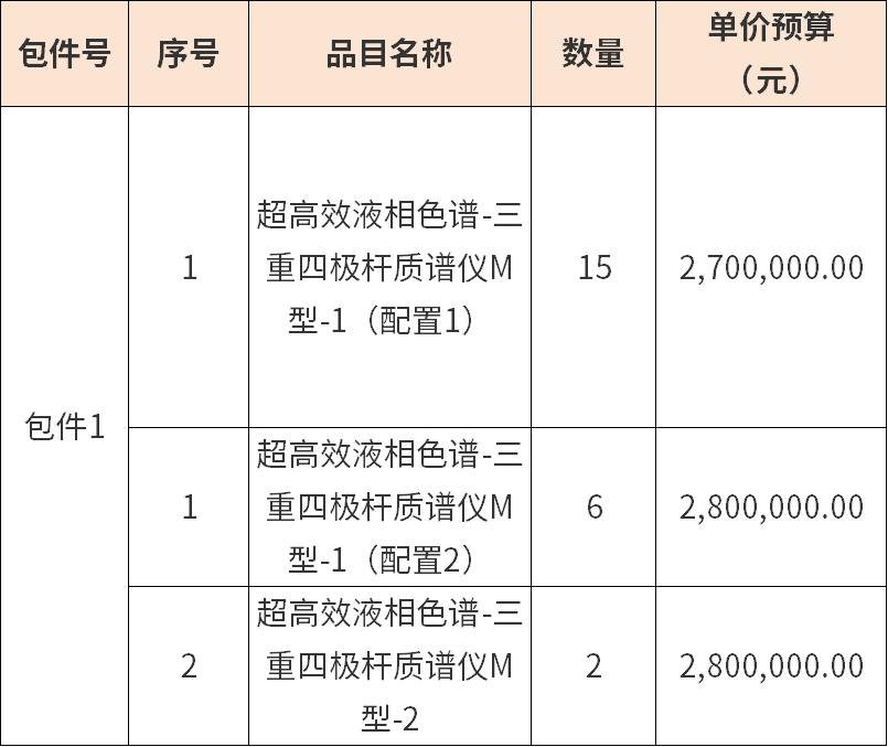 根據公告信息,采購超高效液相色譜-三重四極桿質譜儀M-1(配置115臺套,超高效液相色譜-三重四極桿質譜儀M-1(配置26臺套,超高效液相色譜-三重四極桿質譜儀M-2采購2臺套。產品需交付至海關指定地點,時間不得超過正式簽訂合同后30個日歷日,并提供為期三年的質保服務。